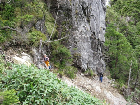 小ピークを越え次の岩壁へと登り直す。突き当たり岩壁下部を巻き、草付きのトラバースを過ぎると最後の問題箇所、崩壊地点。