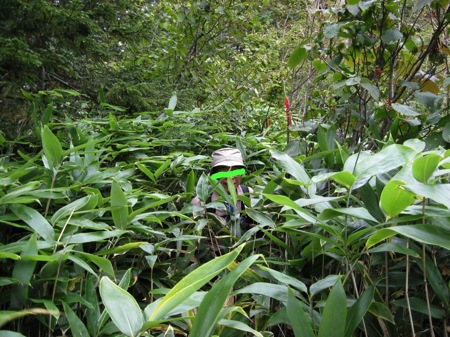我々は踏み跡がある笹のブッシュを岩壁の方へ。ここもブッシュの中に赤リボンが細かく続いていた。