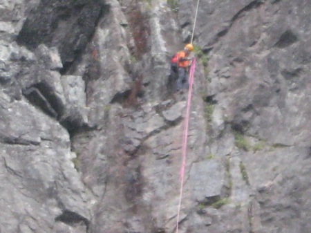 前衛壁を見上げると午前中に登っていたクライマーがザイルを壁面に垂らし下降するところだった。