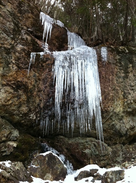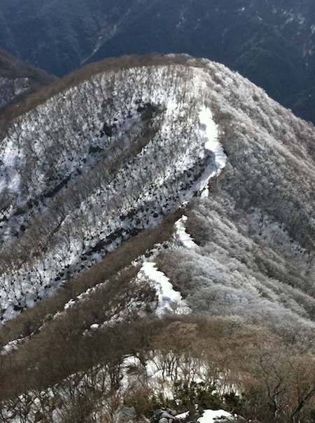 山頂では4方向かから登ってきた4名だけ。K氏と南のテラスで軽食をとり、下山を中道から氷柱の成長を見に