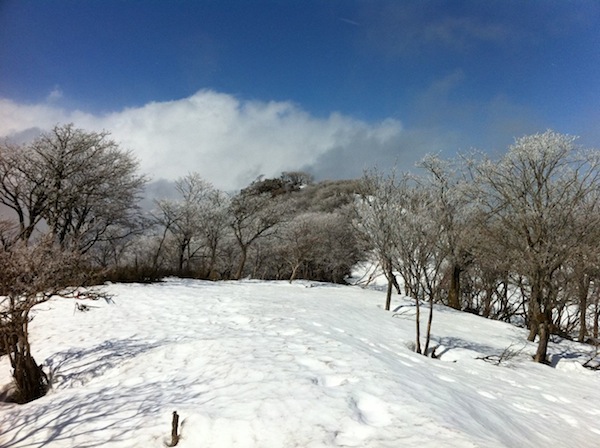 岩場からは適度の冷風が吹き抜け出し快調に登れた。山頂主稜線上だけ所々に積雪があるだけになっていた。