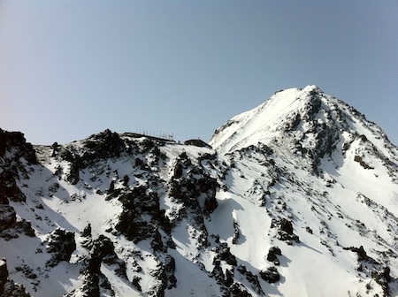 若干汗ばみながら登高。積雪は主稜だけ。山頂北側斜面にはヤヤ残っている。